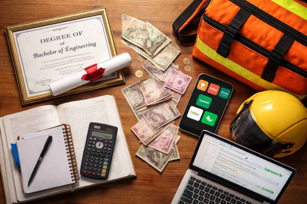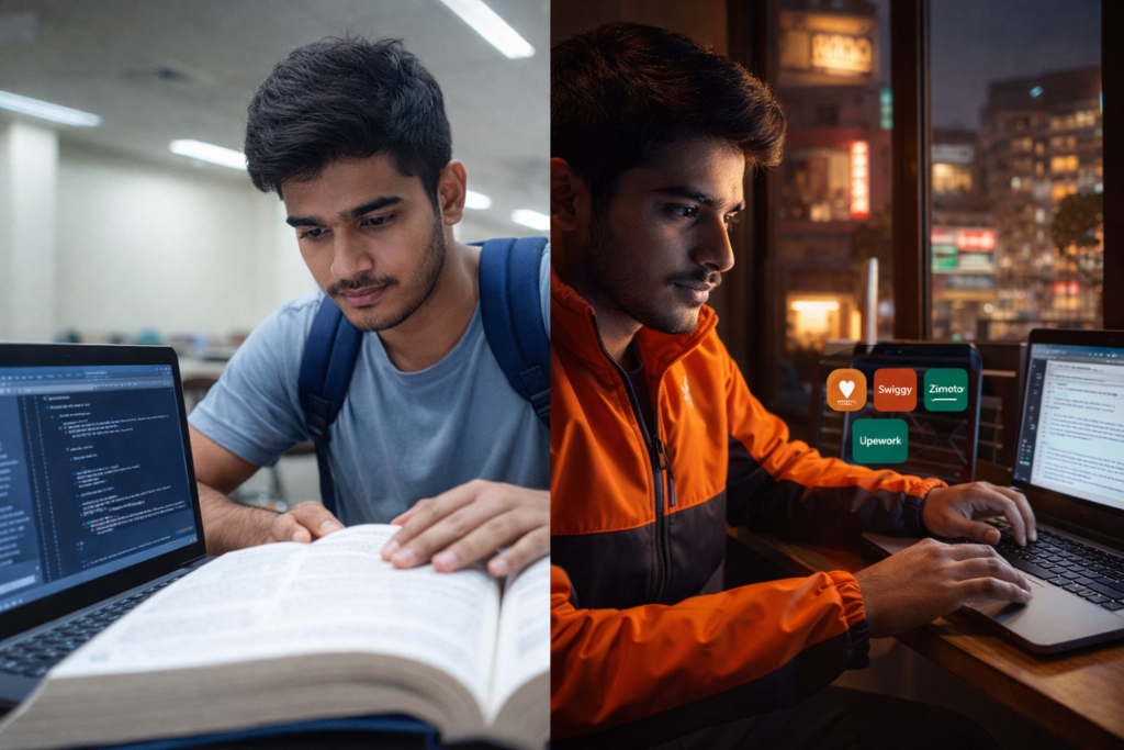 Walk into any tier-2 engineering hostel at 8 PM. Students who sat through data structures lectures are finishing freelance coding projects or getting ready for delivery shifts. One activity is supposed to make them engineers. The other pays their phone bills.